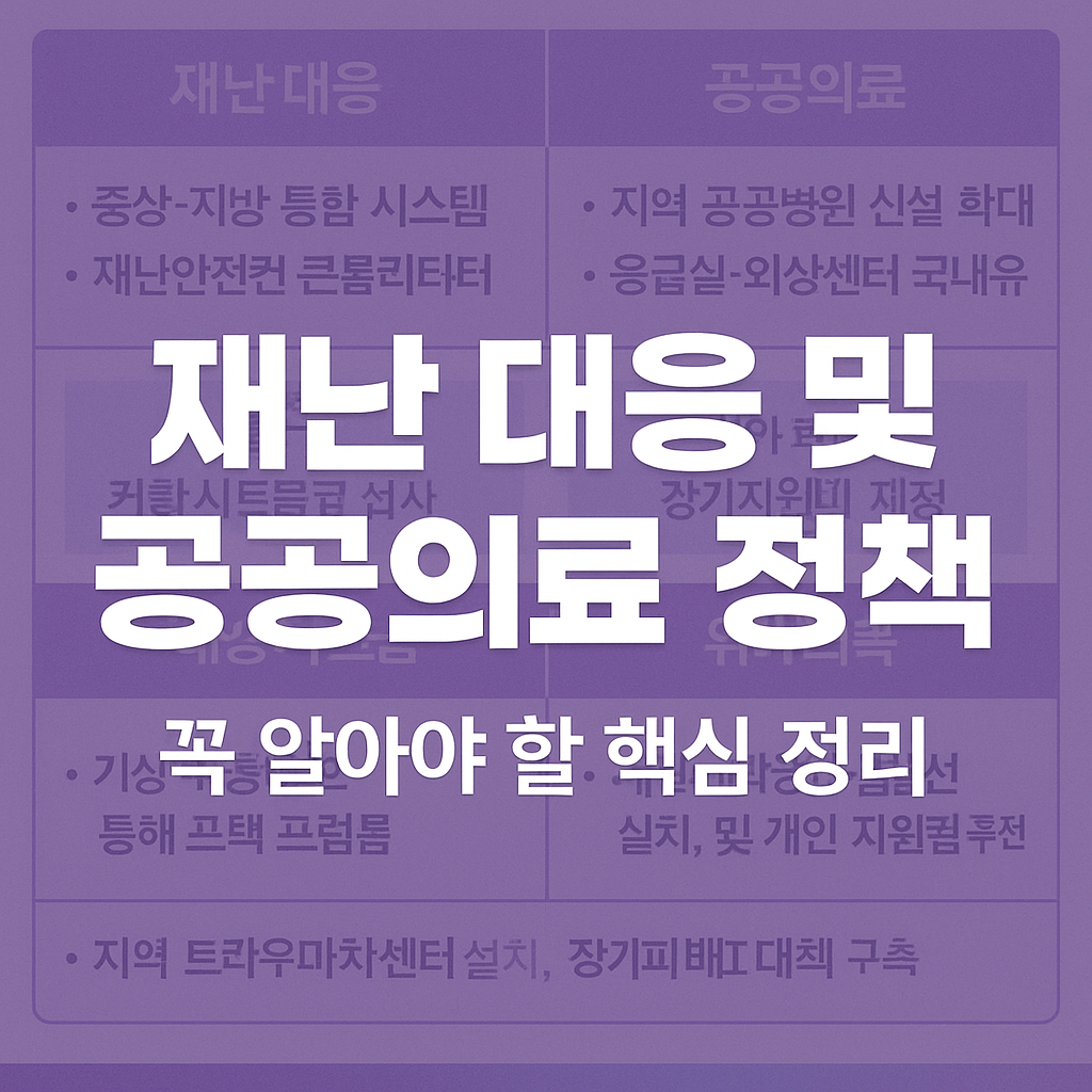 이재명 후보는 국민 생명과 안전을 '국가의 최우선 책무'로 선언하며, **예방-대응-회복**의 전 과정을 담은 재난안전 시스템 개편을 공약했습니다. 또한 지역 격차 없는 공공의료 인프라 확대를 통해, ‘아프면 치료받을 수 있는 사회’를 만들겠다고 밝혔습니다. 정책 방향은 ▲국가주도 통합 대응체계 ▲공공병원 확충 ▲의료 사각지대 해소로 정리됩니다.